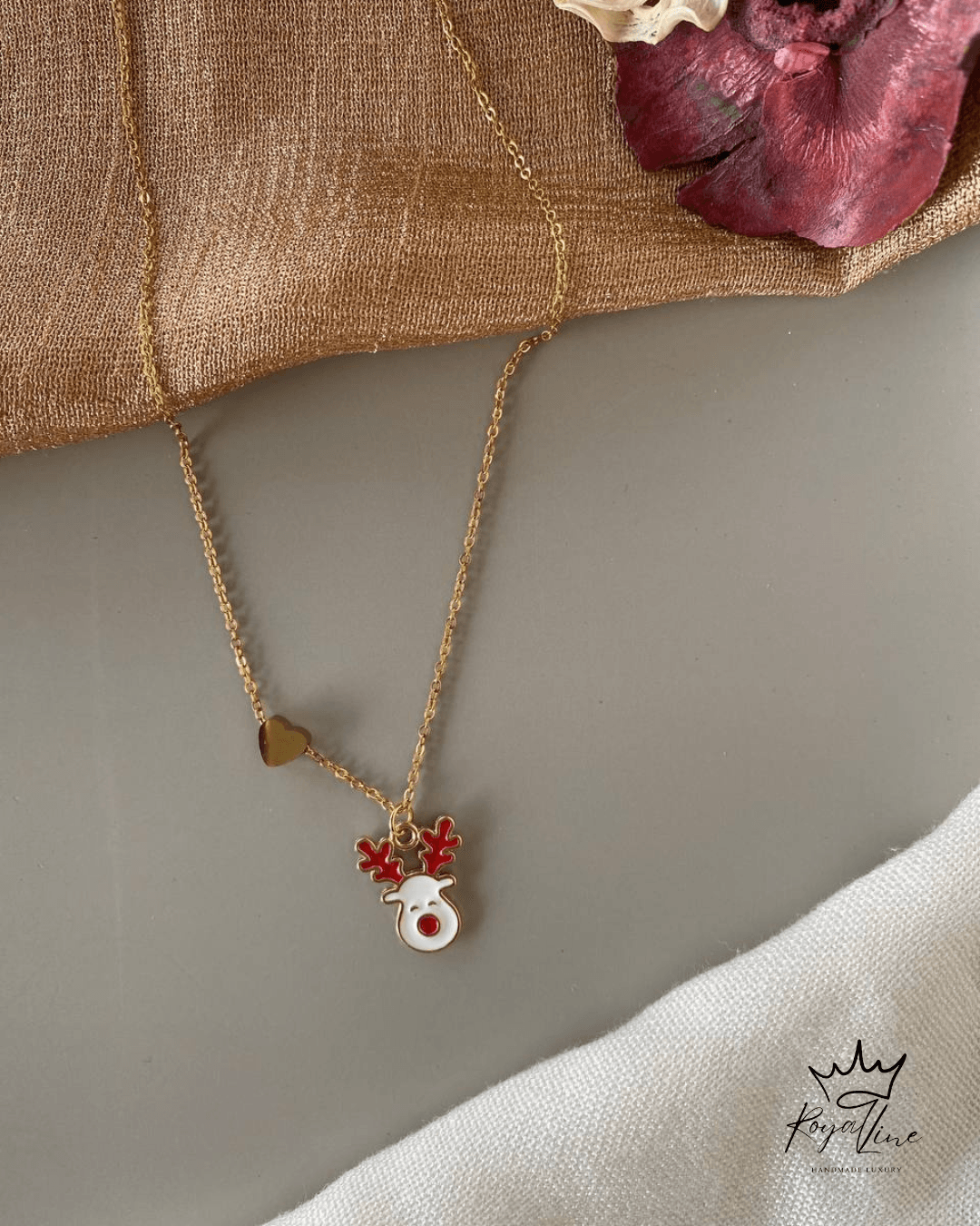 Λεπτό κολιέ από ανοξείδωτο ατσάλι σε χρυσό τόνο, με κρεμαστό μεταλλικό στοιχείο τάρανδο από σμάλτο σε αποχρώσεις gold/white/red. Στην αλυσίδα υπάρχει και μια μικρή χρυσή ατσάλινη καρδιά που προσθέτει extra cute λεπτομέρεια.