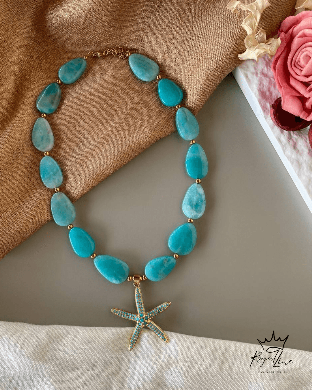 Το Aegean Starfish (Amazonite) είναι ένα statement κολιέ εμπνευσμένο από το Αιγαίο. Οι πέτρες αμαζονίτη, με φυσικές νεράδες και απαλές τιρκουάζ αποχρώσεις, δίνουν μια καθαρή και κομψή καλοκαιρινή αισθητική, ενώ ο αστερίας ολοκληρώνει το σχέδιο με μία διακριτική “seaside” υπογραφή!
