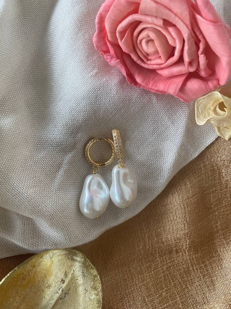 Χειροποίητα σκουλαρίκια με εντυπωσιακές μπαρόκ πέρλες και χρυσούς κρίκους με διακριτικές ζιργκόν λεπτομέρειες.