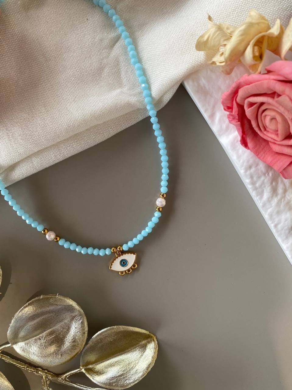 Κολιέ Aegean Eye – Χειροποίητη δημιουργία με γαλάζιες χάντρες Α ποιότητας, χρυσές ατσάλινες λεπτομέρειες και σμάλτινο μάτι στο κέντρο. Ένα κόσμημα που συνδυάζει την εκλεπτυσμένη πολυτέλεια με τον διαχρονικό συμβολισμό της προστασίας.