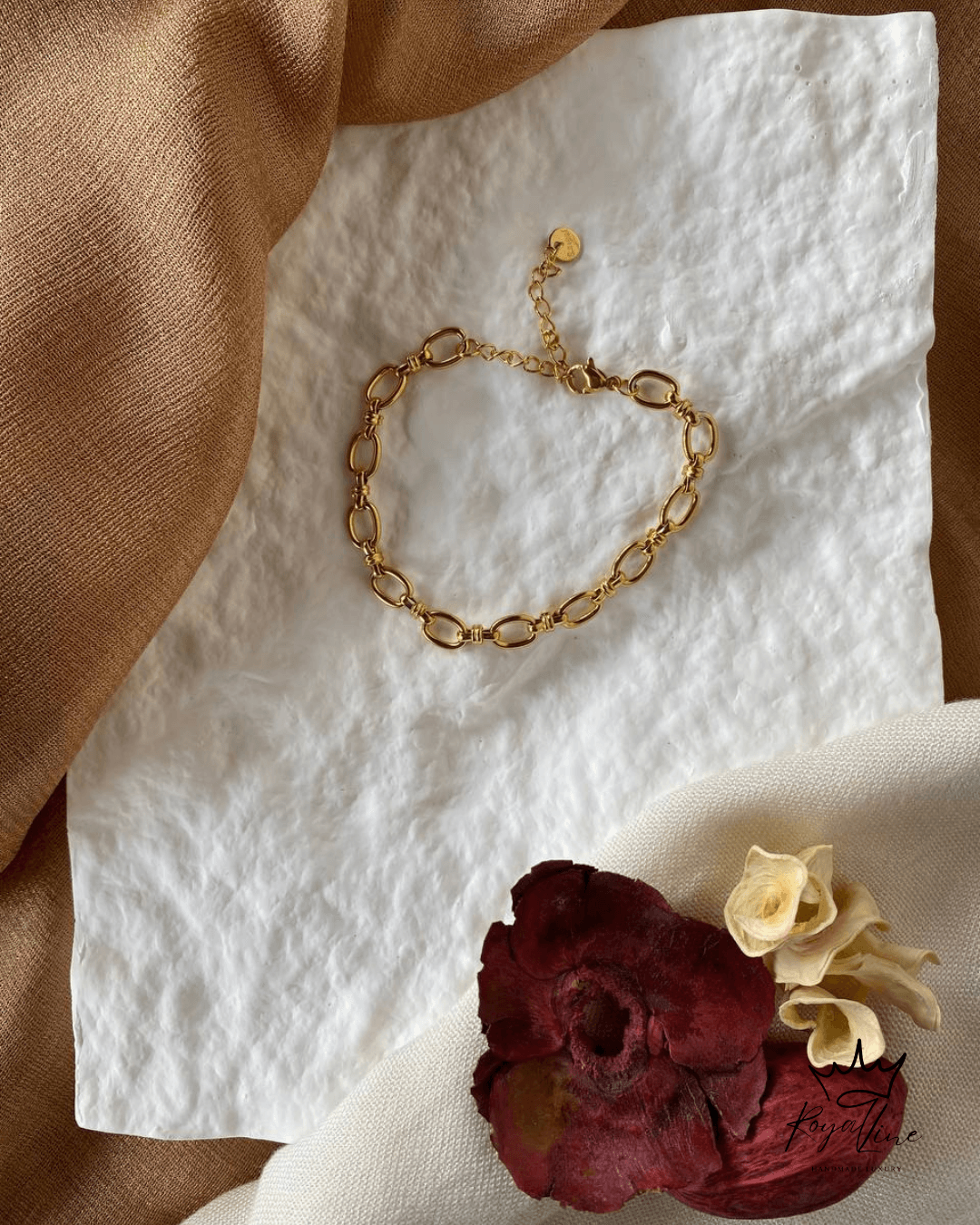 Χειροποίητο βραχιόλι από ανοξείδωτο ατσάλι σε gold τόνο, με κομψούς οβάλ κρίκους που δημιουργούν μια διακριτική, αλλά statement αλυσίδα. Φοριέται άνετα μόνο του για minimal chic αποτέλεσμα ή μαζί με άλλα βραχιόλια για πιο πλούσιο layering!