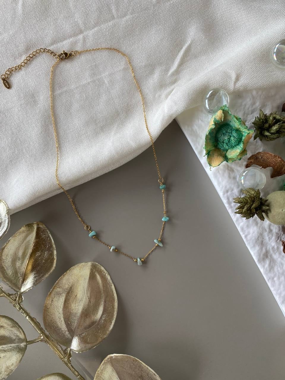 Κολιέ Ocean Whisper – Χειροποίητη δημιουργία με ημιπολύτιμες πέτρες σε γαλαζοπράσινους τόνους και χρυσή ατσάλινη αλυσίδα. Ένα κομψό κόσμημα που αποπνέει φρεσκάδα και πολυτέλεια, σαν την αντανάκλαση του ήλιου πάνω στη θάλασσα.