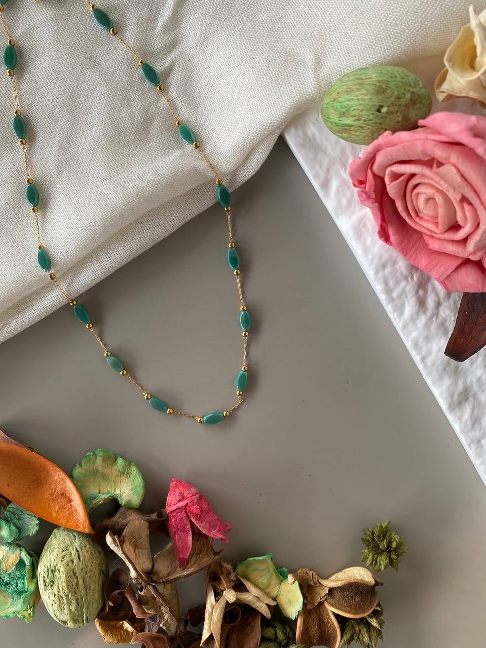 Κολιέ Emerald Queen – Χειροποίητη δημιουργία με πράσινα-πετρόλ κρυσταλλάκια και ατσάλινη αλυσίδα σε χρυσό τόνο. Ένα εκλεπτυσμένο κόσμημα που παίζει με το φως, χαρίζοντας μια αύρα διακριτικής πολυτέλειας σε κάθε σου εμφάνιση.