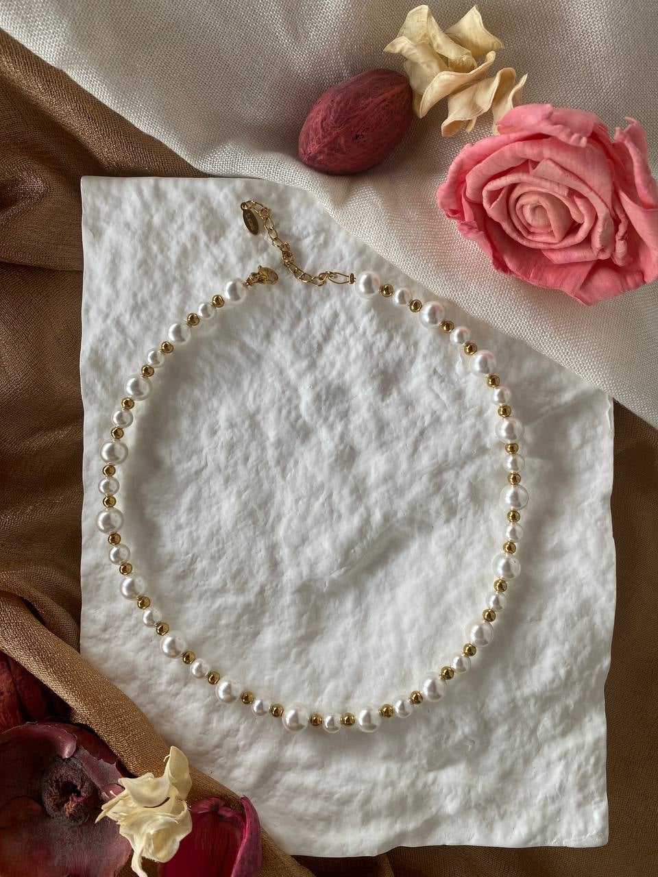 Χειροποίητο κολιέ με λευκές πέρλες δύο μεγεθών και επιχρυσωμένες μπίλιες ανάμεσά τους.