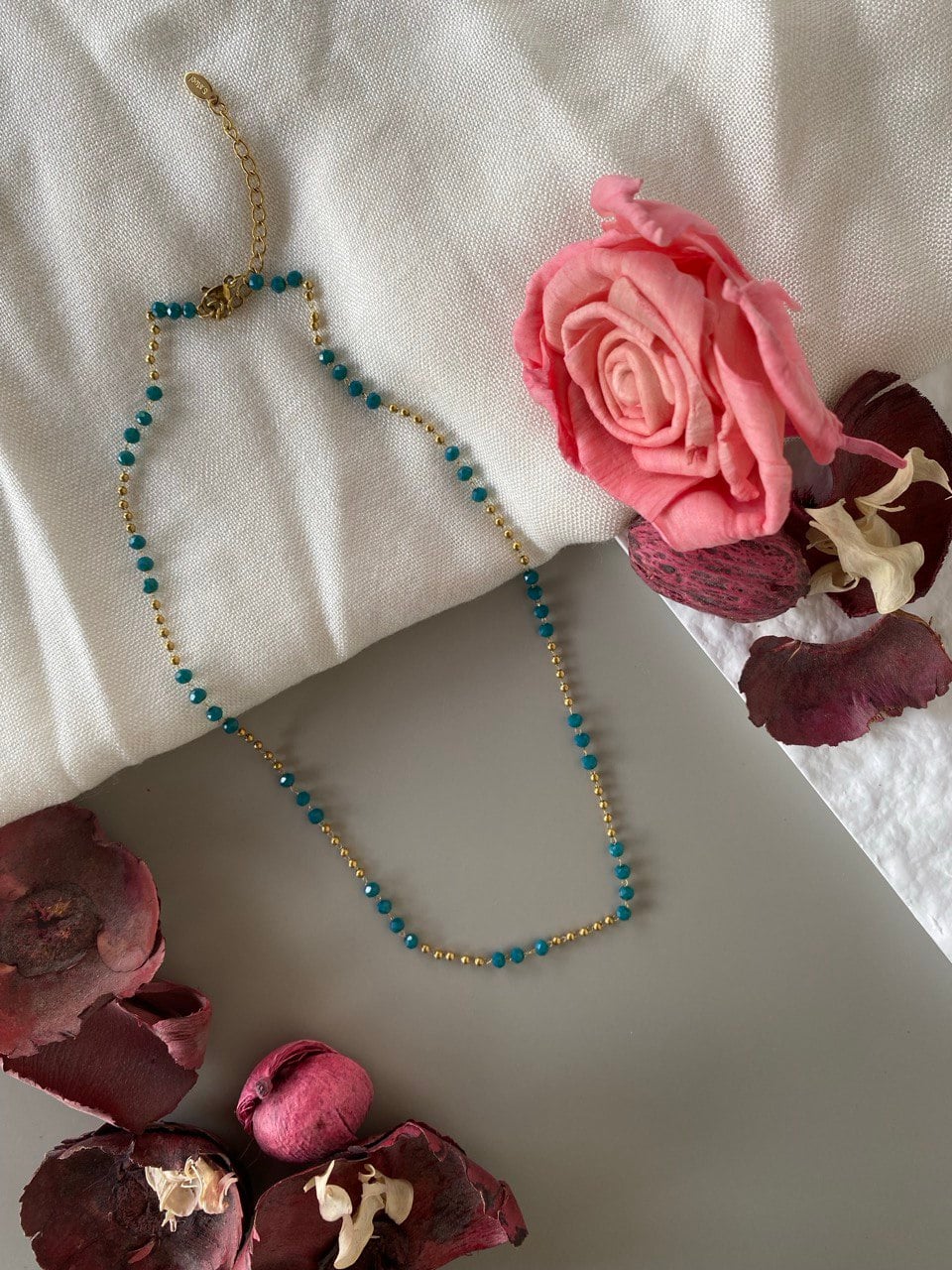 Χειροποίητο κολιέ με χρυσή ατσάλινη αλυσίδα και κρυσταλλάκια πετρόλ (teal). Οι μικρές χρυσές χάντρες δημιουργούν διακριτικές αντανακλάσεις, σαν αντικατοπτρισμό λιμνοθάλασσας. Ελαφρύ και κομψό, ιδανικό για καθημερινό & βραδινό styling!