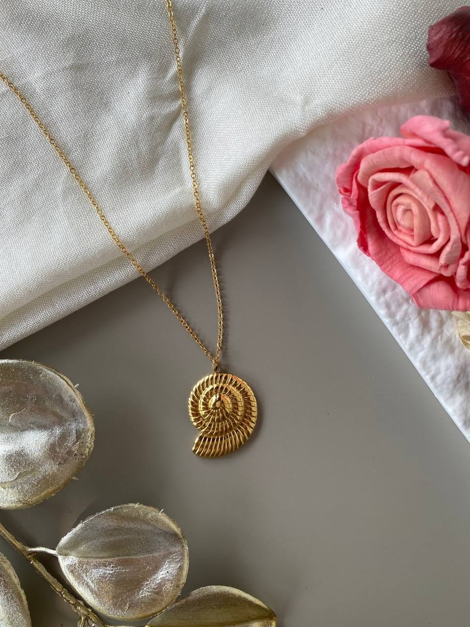 Χειροποίητο κολιέ με χρυσή ατσάλινη αλυσίδα και εντυπωσιακό κρεμαστό σε σχήμα κοχυλιού/σπείρας 316L. Ένα κόσμημα που αποπνέει αρμονία και καλοκαιρινή φινέτσα, εμπνευσμένο από τη θάλασσα και τη δύναμη της φύσης. Ιδανικό για γυναίκες που θέλουν να προσθέσουν ένα statement στοιχείο στις εμφανίσεις τους.