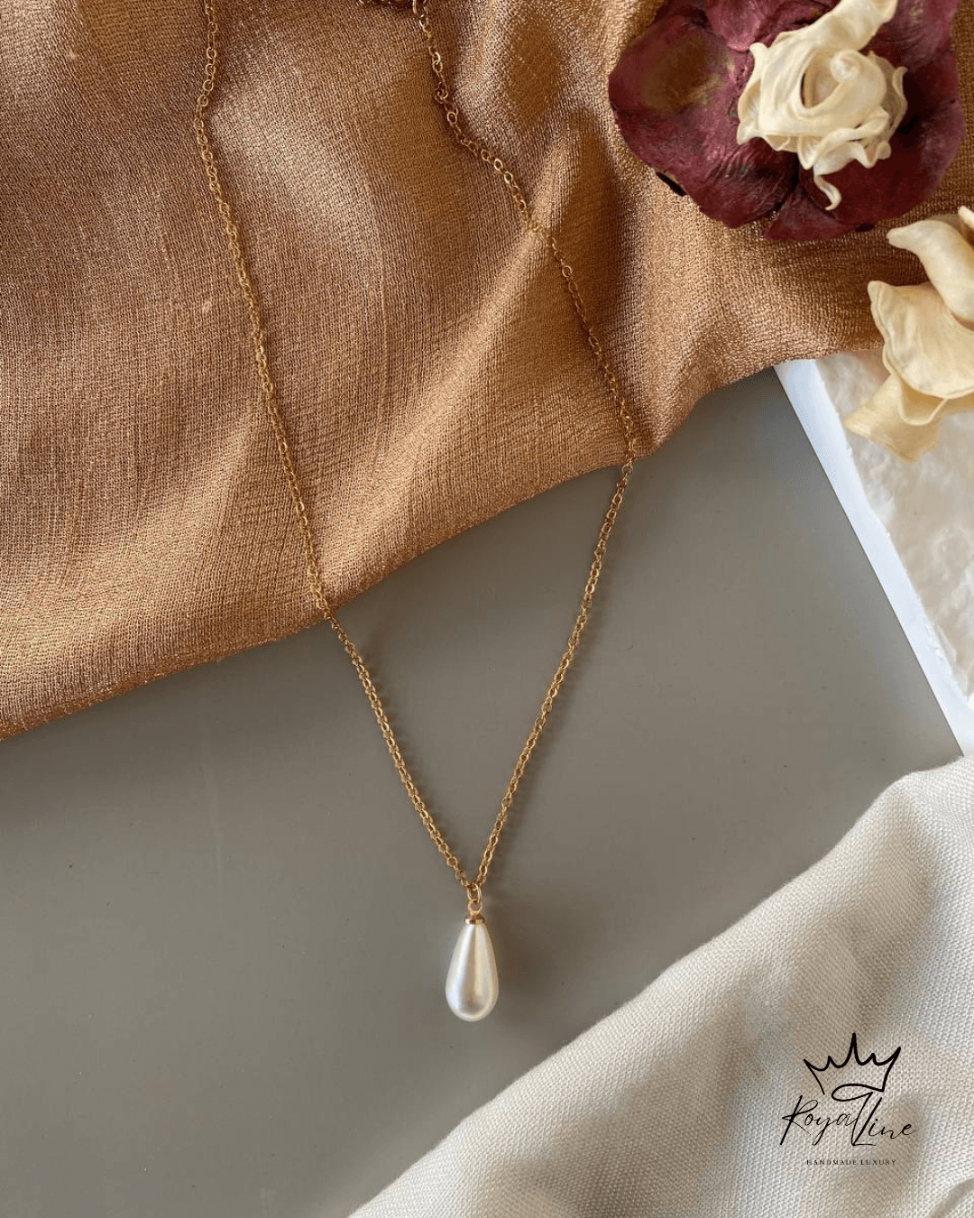 Λεπτό κολιέ με κρεμαστή πέρλα σε σχήμα σταγόνας, δεμένη σε χρυσό κρίκο πάνω σε φίνα ατσάλινη αλυσίδα. Η γυαλιστερή επιφάνεια της πέρλας φωτίζει το ντεκολτέ, ενώ η minimal γραμμή του κολιέ το κάνει ιδανικό τόσο για solo εμφάνιση όσο και για layering με άλλα λεπτά χρυσά κολιέ.