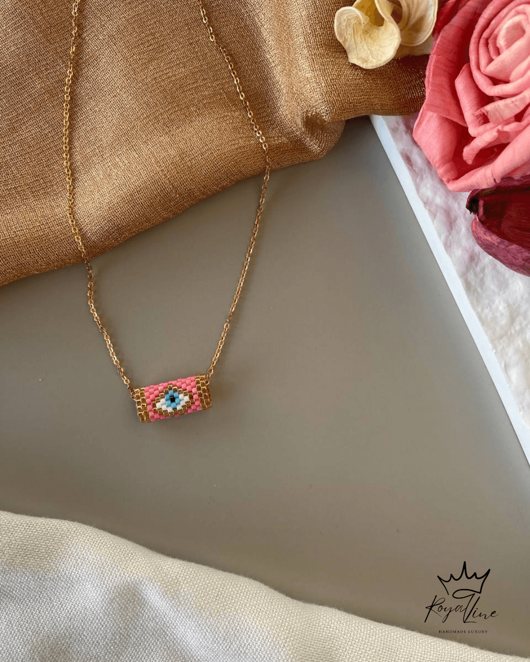 Το Miyuki Pink Eye είναι ένα κομψό, καθημερινό κολιέ με διακριτικό χρώμα και καθαρή γραμμή. Το κεντρικό στοιχείο είναι χειροποίητο με την τεχνική Miyuki, χρησιμοποιώντας μικροσκοπικές ιαπωνικές χάντρες που δίνουν απόλυτη λεπτομέρεια και “καθαρό” σχέδιο.