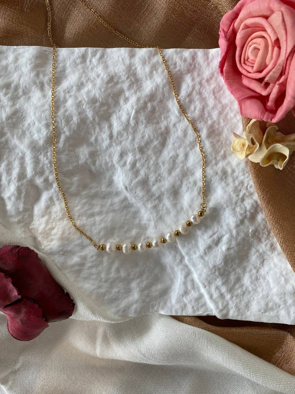 Κολιέ Imperial Pearl– Χειροποίητη δημιουργία με μαργαριτάρια γλυκού νερού και επιχρυσωμένες λεπτομέρειες πάνω σε χρυσή ατσάλινη αλυσίδα. Ένα αριστοκρατικό κόσμημα που αποπνέει διαχρονική κομψότητα και θηλυκότητα.
