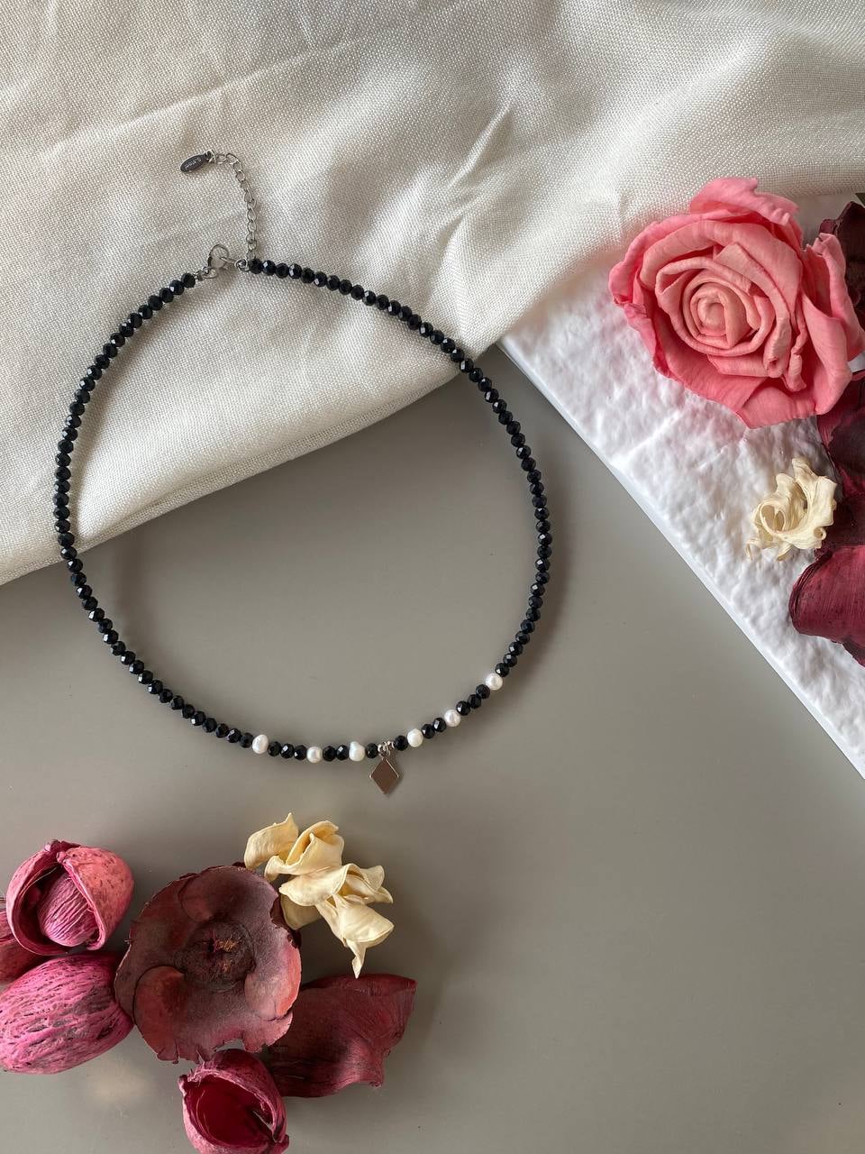 Κολιέ Royal Eclipse – Χειροποίητο κόσμημα με μαργαριτάρια γλυκού νερού, μαύρες χάντρες Α ποιότητας και ατσάλινες λεπτομέρειες. Ο γεωμετρικός ρόμβος στο κέντρο συμβολίζει δύναμη και αρμονία, δημιουργώντας ένα κόσμημα με έντονη προσωπικότητα και διαχρονική κομψότητα.