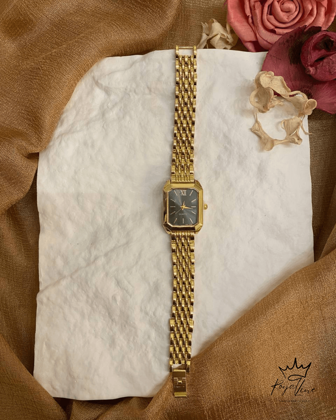 Ένα διαχρονικό ρολόι που στηρίζεται στην κομψή αντίθεση: χρυσός τόνος και μαύρο καντράν. Η ορθογώνια κάσα δίνει vintage αισθητική, ενώ το μπρασελέ το κάνει να κάθεται στον καρπό σαν κόσμημα.