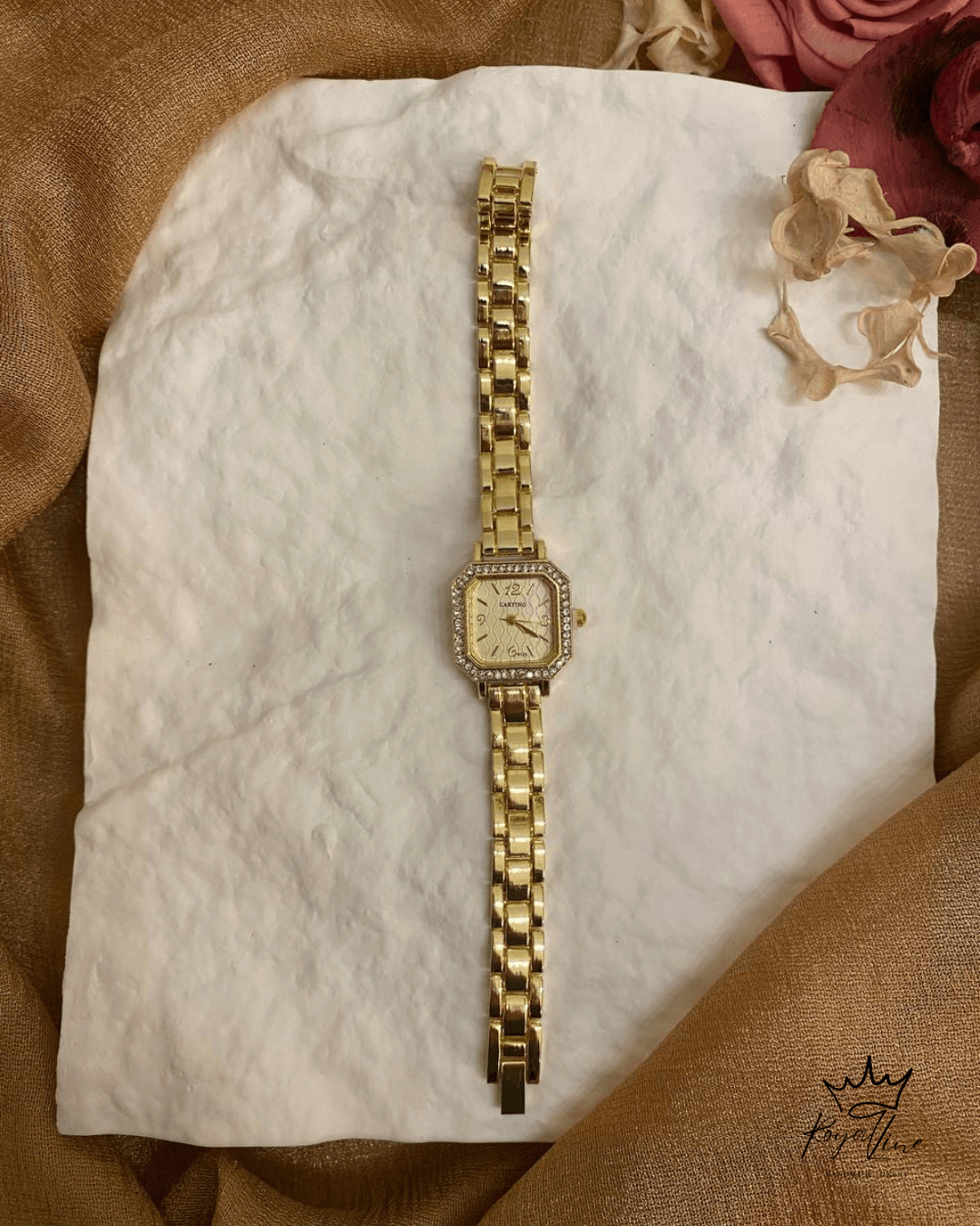 Ένα τετράγωνο ρολόι με glamorous χαρακτήρα, σχεδιασμένο για να τραβάει το βλέμμα. Η χρυσή απόχρωση και το περίγραμμα από στρας χαρίζουν λάμψη, ενώ το μεταλλικό μπρασελέ κρατάει το look κομψό και “δεμένο”.